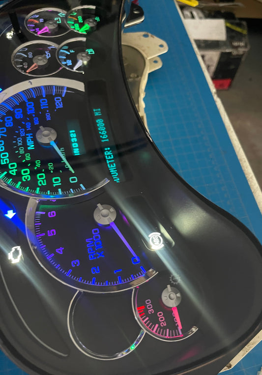 11. 2003-2007 Gmc Chevrolet OEM Rebuilt Refurbished Instrument Gauge Cluster Cadillac Escalade , (BLUE WHITE with white Overlay) Silverado, Sierra, Tahoe, Denali Suburban, Avalanche, Yukon, W/ Trans Temp Speedometer