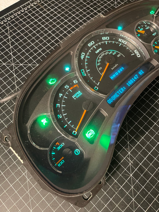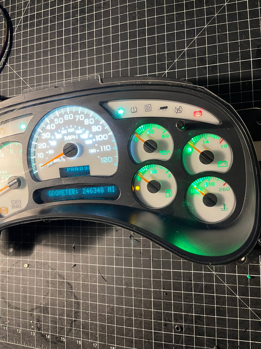 2003-2007 Gmc Chevrolet OEM Rebuilt Refurbished Instrument Gauge Cluster Cadillac Escalade , (GREEN GOBLIN white Overlay) Silverado, Sierra, Tahoe, Denali Suburban, Avalanche, Yukon, W/ Trans Temp Speedometer