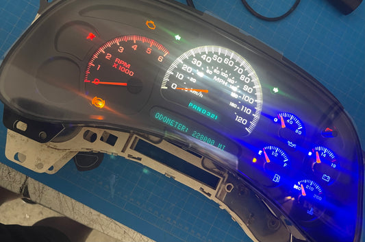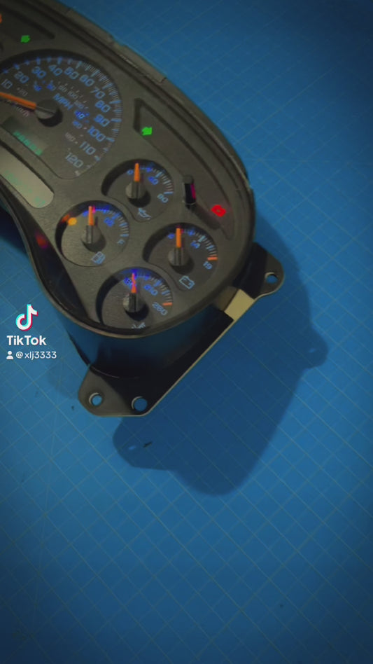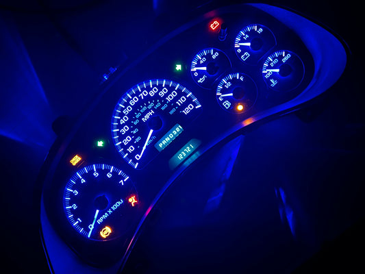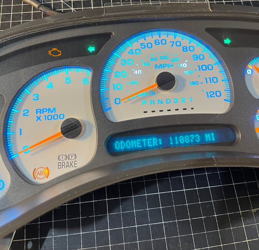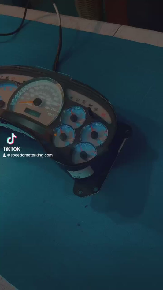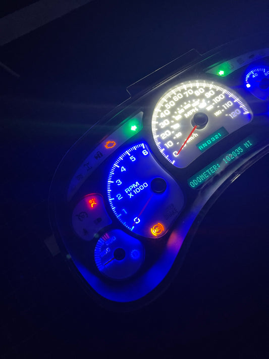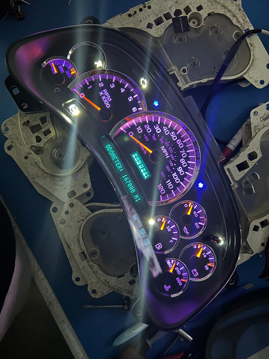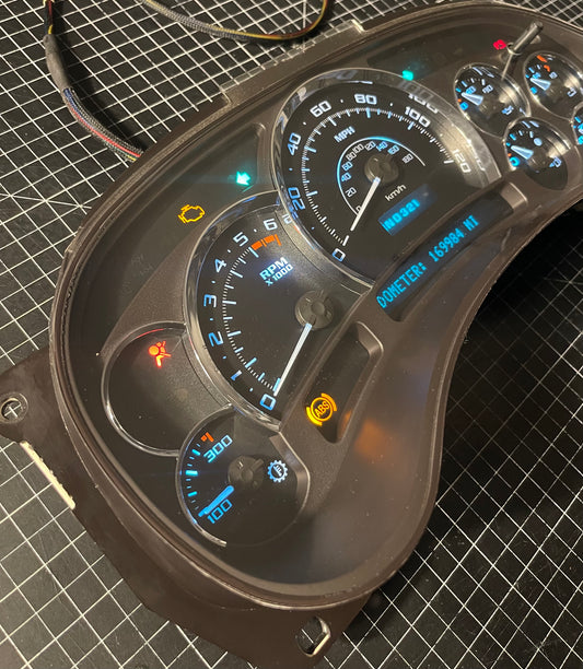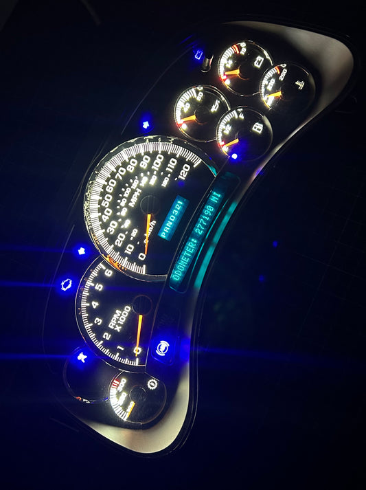 2003-2007 Gmc Chevrolet OEM Rebuilt Refurbished Instrument Gauge Cluster Cadillac Escalade , (BLUE WHITE with white Overlay) Silverado, Sierra, Tahoe, Denali Suburban, Avalanche, Yukon, W/ Trans Temp Speedometer