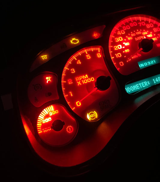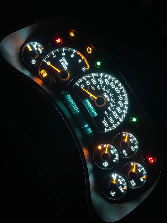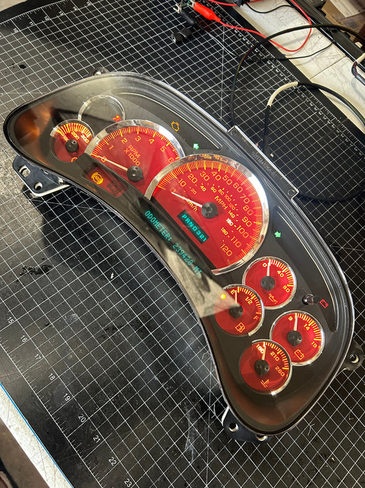 2003-2007 Gmc Chevrolet OEM Rebuilt Refurbished Instrument Gauge Cluster Cadillac Escalade , (RED WHITE with white Overlay) Silverado, Sierra, Tahoe, Denali Suburban, Avalanche, Yukon, W/ Trans Temp Speedometer