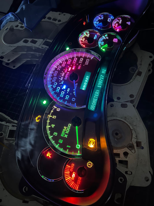 Cadillac Escalade Gmc Chevrolet OEM Rebuilt Refurbished Instrument Gauge Cluster GREEN “ Green Lantern “LED’S 2003 2004 2005 2006 Chevy Silverado Sierra Tahoe Denali Suburban Avalanche Yukon Escalade W/ Trans Temp Speedometer