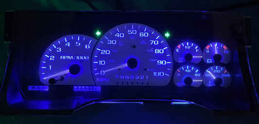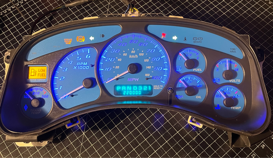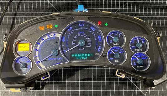 1999-2002 Gmc Chevrolet OEM Rebuilt Refurbished Instrument Gauge Cluster BLUE Cadillac Escalade, Silverado, Sierra, Tahoe, Denali, Suburban, Avalanche, Yukon, W/ Trans Temp Speedometer