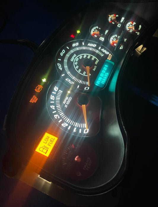 1999-2002 Gmc Chevrolet OEM Rebuilt Refurbished Instrument Gauge Cluster RED Cadillac Escalade, Silverado, Sierra, Tahoe, Denali Suburban, Avalanche, Yukon, W/ Trans Temp Speedometer