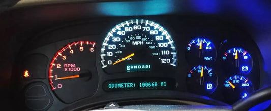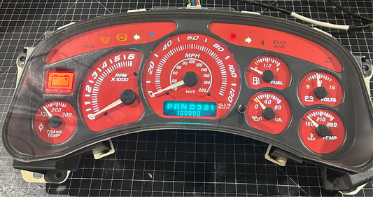 1999-2002 Gmc Chevrolet OEM Rebuilt Refurbished Instrument Gauge Cluster RED Silverado, Sierra, Tahoe, Denali Suburban, Avalanche, Yukon, Without Trans Temp, Speedometer (No Trans Temp)