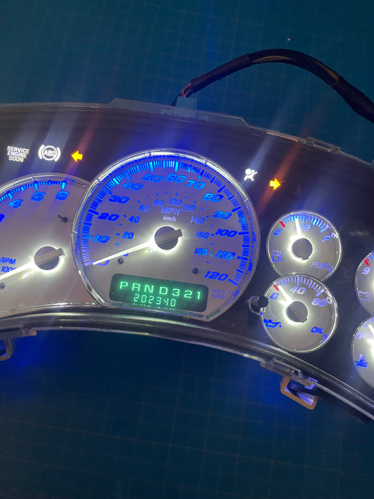 2003-2007 Gmc Chevrolet OEM Rebuilt Refurbished Instrument Gauge Cluster Cadillac Escalade , (BLUE WHITE with white Overlay) Silverado, Sierra, Tahoe, Denali Suburban, Avalanche, Yukon, W/ Trans Temp Speedometer